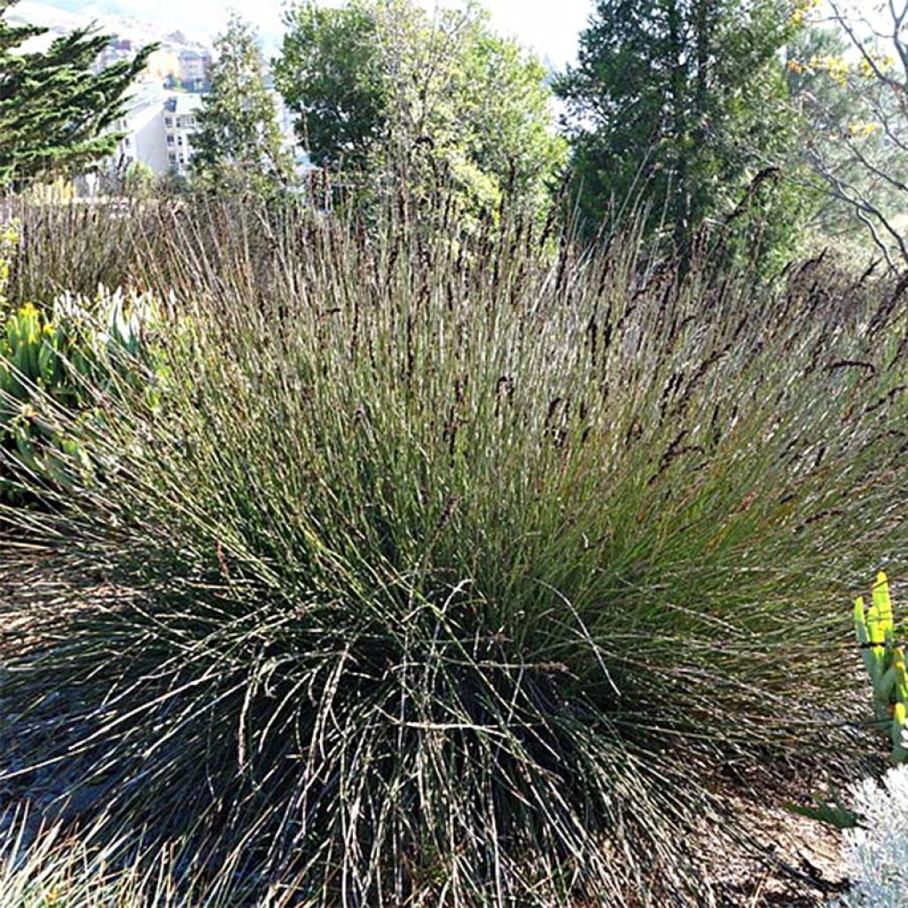 Le Restio est peu rustique, en particulier dans ses jeunes années, mais il se contente de peu, même d’un sol sableux et pauvre. Sa silhouette de grande graminée mouchetée de noir fait beaucoup d’effet dans un massif naturaliste, un décor épuré ou sur une terrasse de style contemporain. Une plante bien établie sera capable d’endurer -8/-9°C, de façon ponctuelle, ce qui permet de la cultiver en pleine terre sous nos climats doux. Peu exigeante en eau, résistante aux embruns, elle est particulièrement adaptée aux jardins côtiers. On peut l’utiliser de manière très décorative également sur la terrasse, à remiser en climat froid. En pleine terre ou en pot, son association avec les étonnants Boronia, des prêles, les Dierama, Miscanthus, Carex comans ou encore un Gomphostigma virgatum est toujours réussie. Ses fleurs sont aussi très belles dans les bouquets secs.